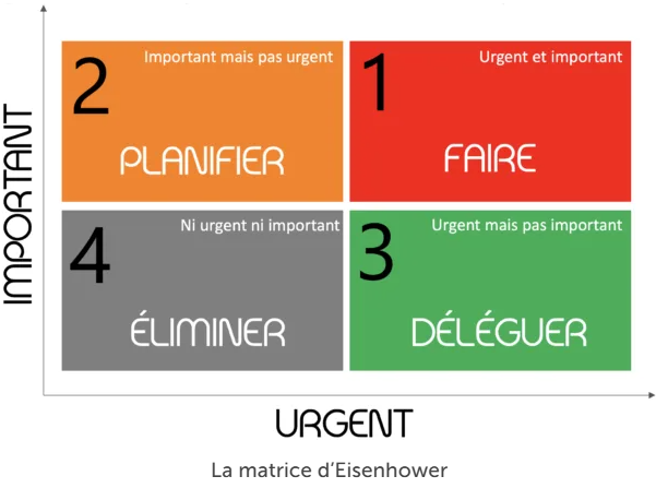 1er outil : La matrice d’Eisenhower. Elle classe chaque tâche selon deux critères : l’urgence et l’importance. Il en résulte 4 scénarios et donc 4 actions.